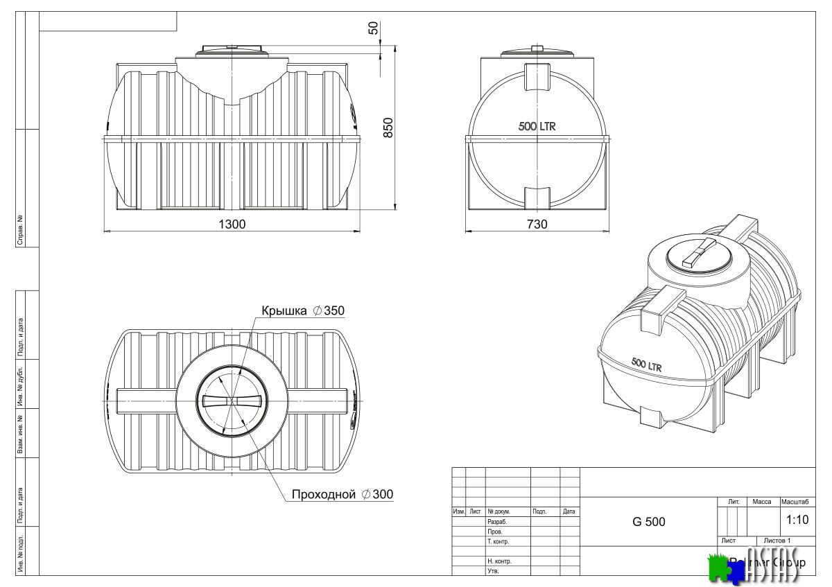 Горизонтальная цилиндрическая емкость G 500 л предназначена для хранения питьевой и технической воды, дизельного топлива.