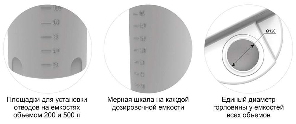 Дозировочные емкости имеют устойчивую цилиндрическую форму и оснащены: