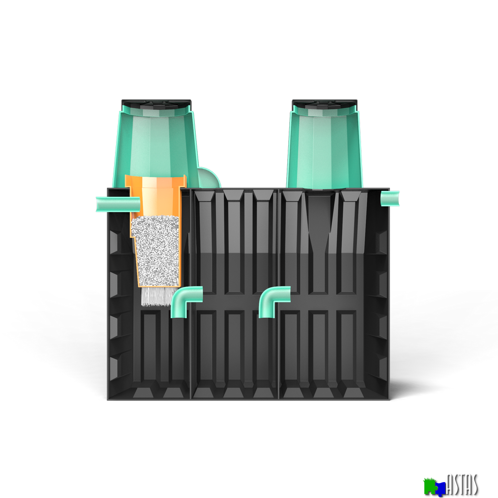 Стоки попадают в септик и отстаиваются в первой секции. Тяжёлые фракции опадают вниз, а жировая масса всплывает на поверхность Дальше жидкость из средней части попадает во вторую и третью секции, где проходя через загрузку фильтрующего элемента выходит в поле орошения, где происходит окончательная очистка стоков, при помощи бактерий из септика и за счёт фильтрации через почву.