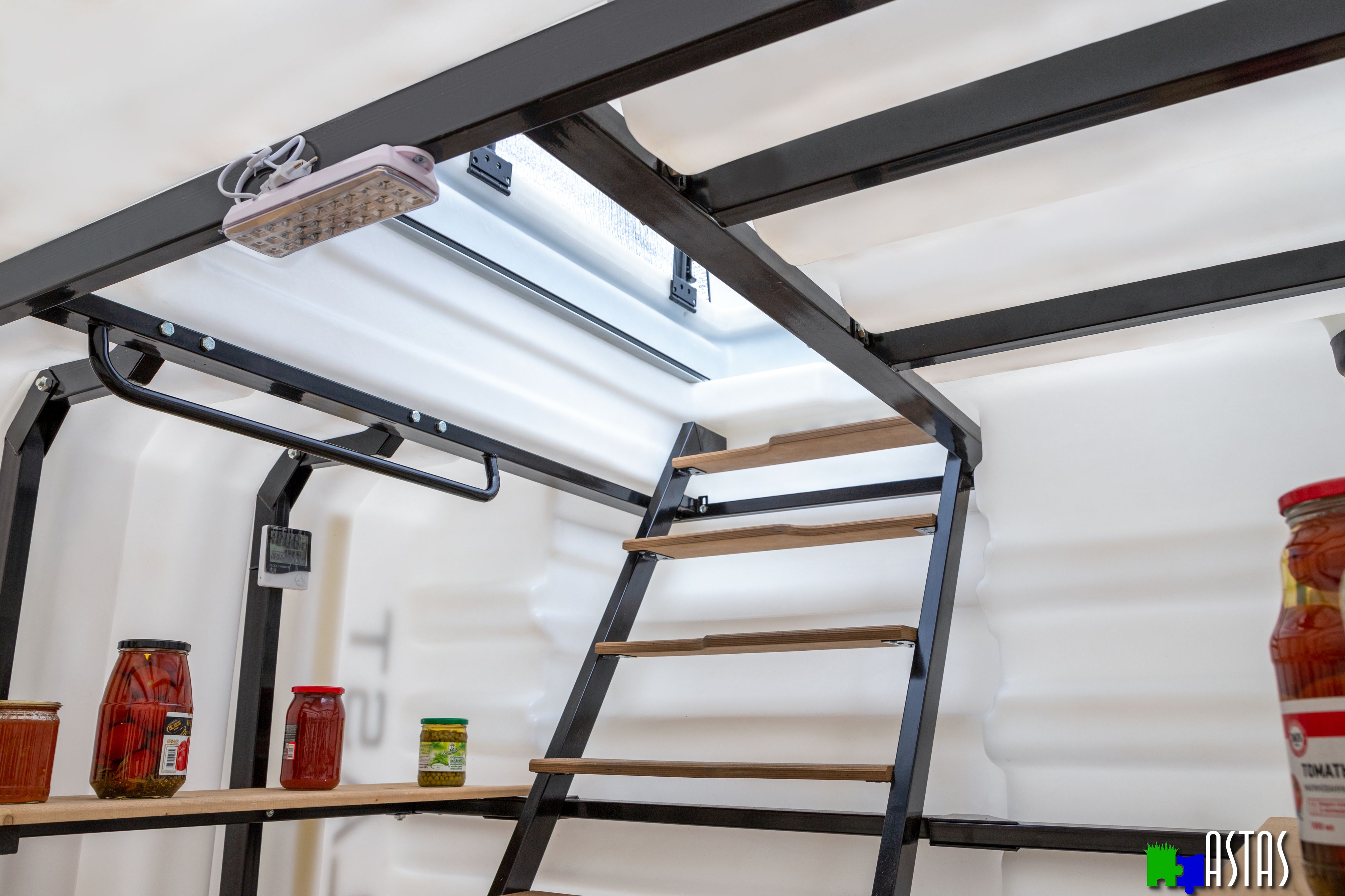 Модель 1900К имеет габариты 2500x1900x2650 и объём 7,5 кубических метров, в неё помещается до 200 банок (3-х литровых) и 20 ящиков (стандартных).